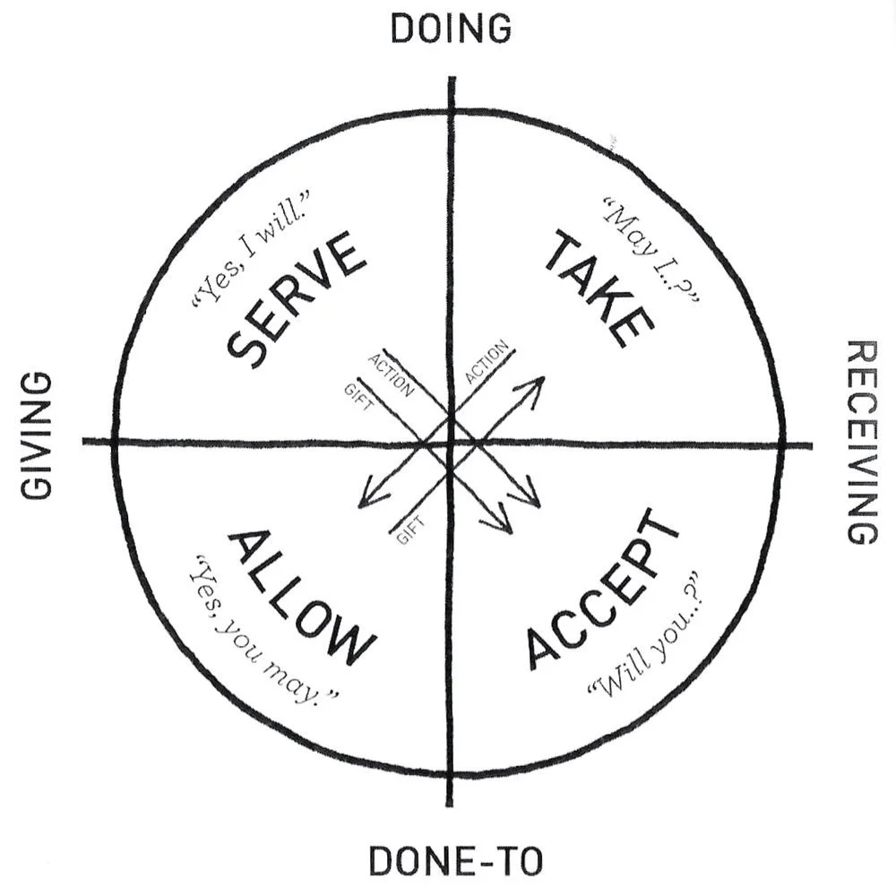 The taker says, “May I do this to you?” The action is done by the taker but they are receiving from the allower.